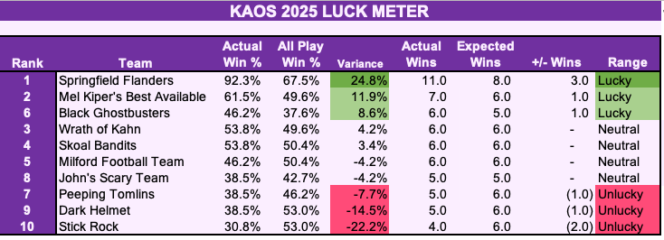 So according to this chart, Flanders had the luckiest team in the league this season. They currently have a .923 winning percentage but if you stack up their point totals for each week and compared it to the rest of the league, their all-play percentage would only be .675. That has led to three additional wins then they should have based on performance.