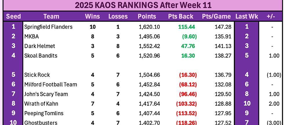 There are just two remaining games on the schedule and the playoff field is still wide open. Only one team has clinched (Flanders) but the fight for the other three spots has tightened up considerably. MKBA and Wrath of Kahn are separated by only one game in the Patrick Division while Skoal Bandits, Stick Rock and MFT are within 68 points of each other for the last Wild Card spot. Only JST, Peeping Tomlins and the Ghostbusters look like they are done for the season.