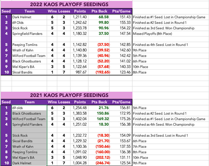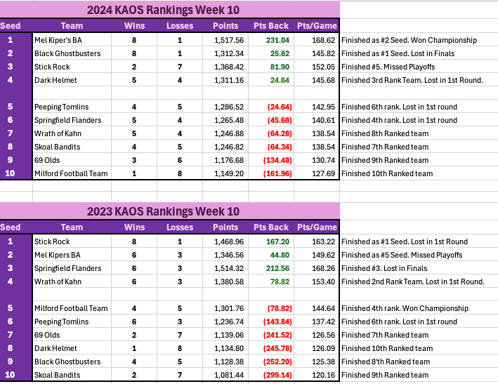 The last 4 Champions have been ranked as follows after 9 Games: 2024 MKBA (#1), 2023 MFT (#5), 2022 Stick Rock (#3), 2021 Springfield Flanders (#4)