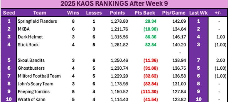 One of the earliest clinches we have seen in KAOS, Flanders is going to the playoffs locked into a #1 or 2 seed. Marvin Harrison awoke just in time to give them a win over the Ghostbusters and a 4 game lead in the division with 4 weeks to go.