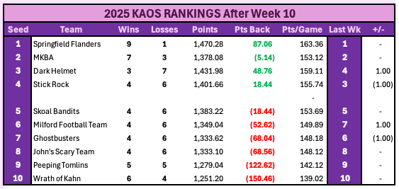 The point total still isn’t among the elite, but the 7 wins looks like it will be good enough for the #2 seed. Kahn in 2nd place is not scaring anyone and Stick Rock can’t seem to put together consecutive wins.